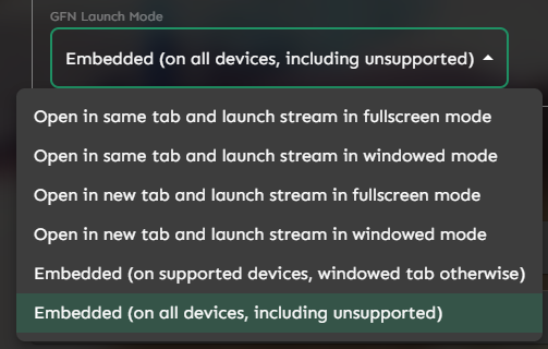 GFN launch mode affects the UX when a user starts a stream from the web, e.g. whether the game opens in a new tab, the same tab and full-screen, or the same tab but within the smaller web player box on the page.