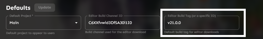 The `Editor Build Tag` input in the Editor section lets you change the default download option that appears in the `Download editor` modal: