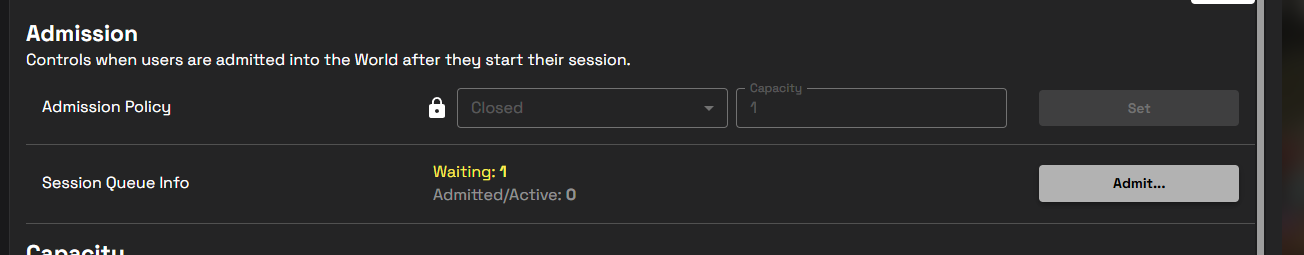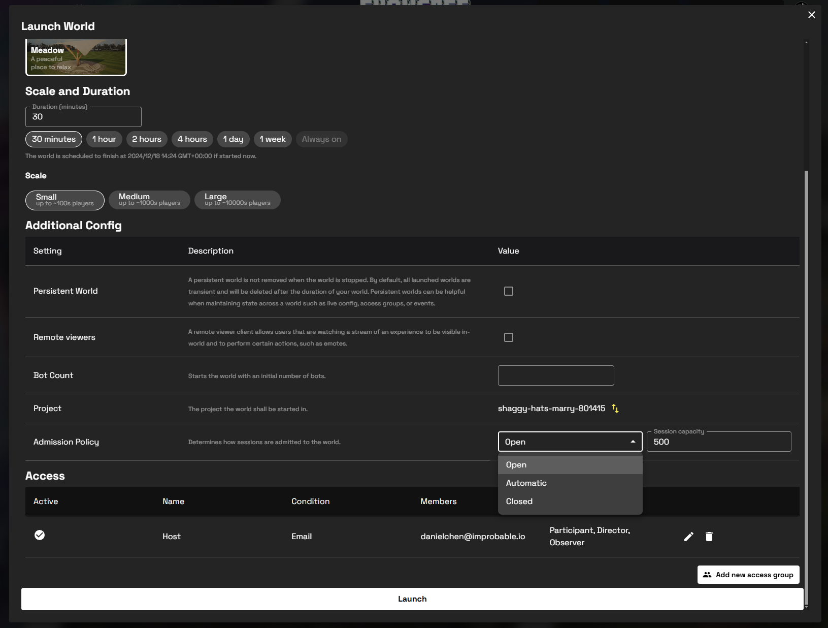 If you want to control capacity and admission, you can set this when launching from the `Launch World` modal on the dashboard. This will control entry to your world both via Streaming and also via downloaded clients.
