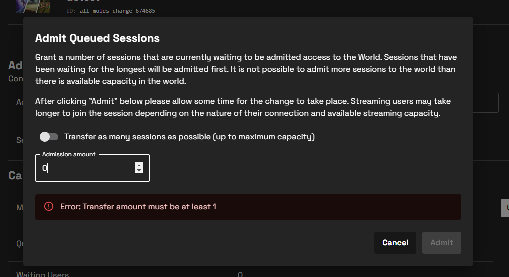 When choosing "Closed" as the admission policy, you will be presented with the ability to view and manage the number of users in your queue. This can be found under the "Operations" tab of your world.