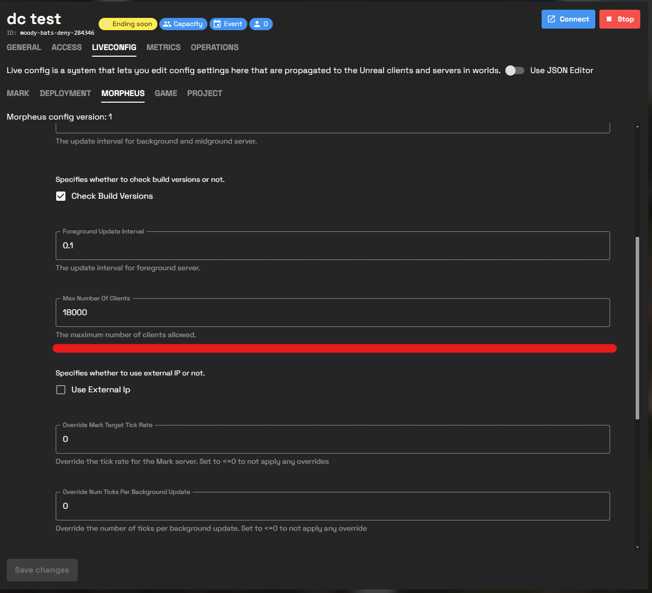 * You can modify your worlds live config to set a maximum number of clients per server. this can be found under `Morpheus -> ConnectionParams -> Server -> Max Number of Clients` :