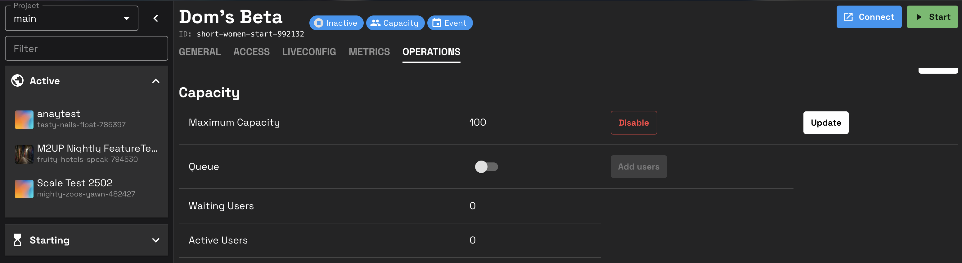 Capacity management & Queuing can be used to cap the number of users able to inhabit a world and manage the rate in which users are able to join. The settings can be found under the Operations tab on a World page. Capacity is defined as the maximum number of available seats in a World.