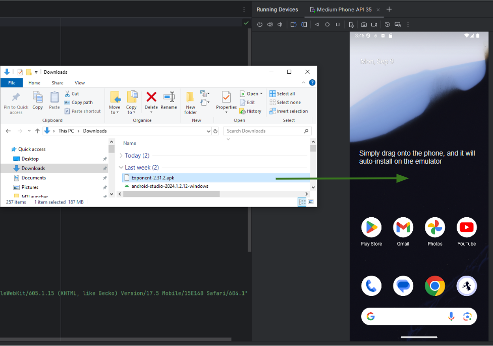 * Drag the `.apk` file onto your virtual device to install app on the emulator