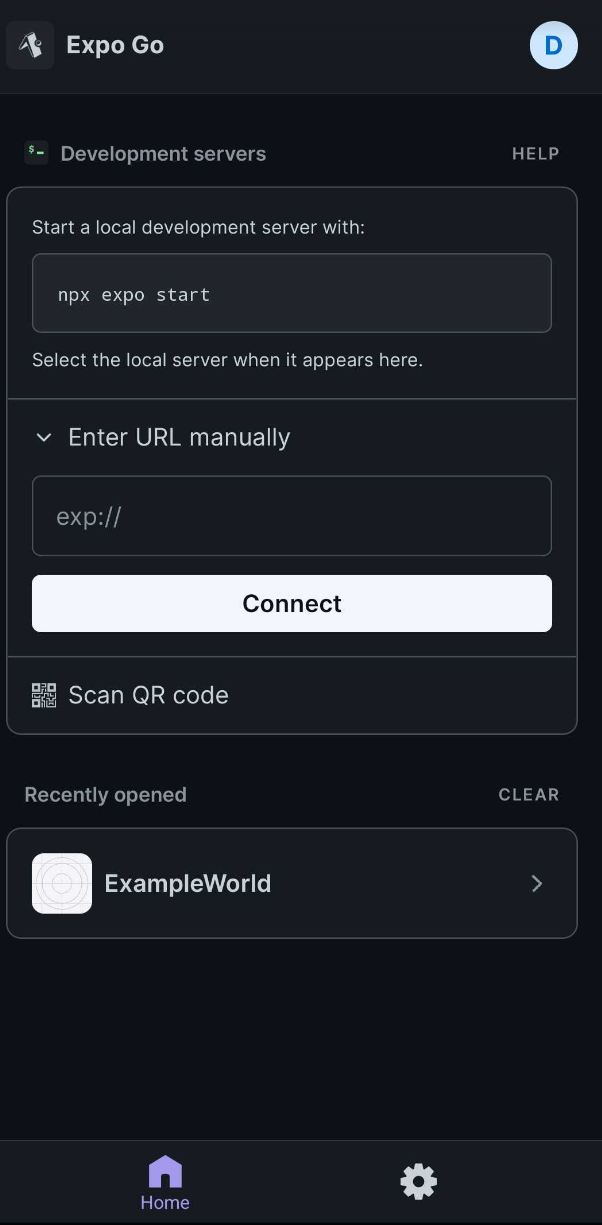 You can now either scan the QR code, or copy and paste the relevant exp\:// url from the logs into the expo app. This should load an example landing page, from which you can enter our example MSquared world.