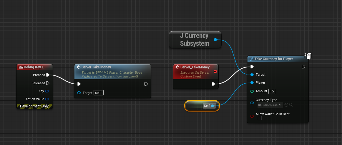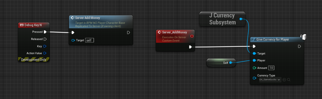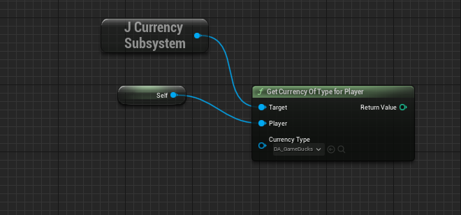 To interact with the players wallet you use the `J_CurrencySubsystem`. This has functions to get, give and take currency from the player's wallet. Examples of each of those can be seen below. Getting a currency can be done on a client, but giving or taking must be done from the server.