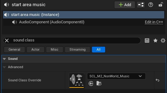 * SoundClass: This property defines the "category" of a sound and to which channel of the mixer system the audio will be routed. For example, this system is used by volume sliders in the pause menu. Adjusting the UI slider will only change the volume of sounds that are being sent to the UI channel, which can be accomplished by setting the SCL\_M2\_NonWorld\_UI SoundClass.\\