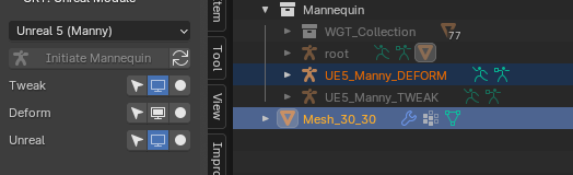 * Select the Game Rig Tool tool and press `Initiate Mannequin` to add the skeletons.
