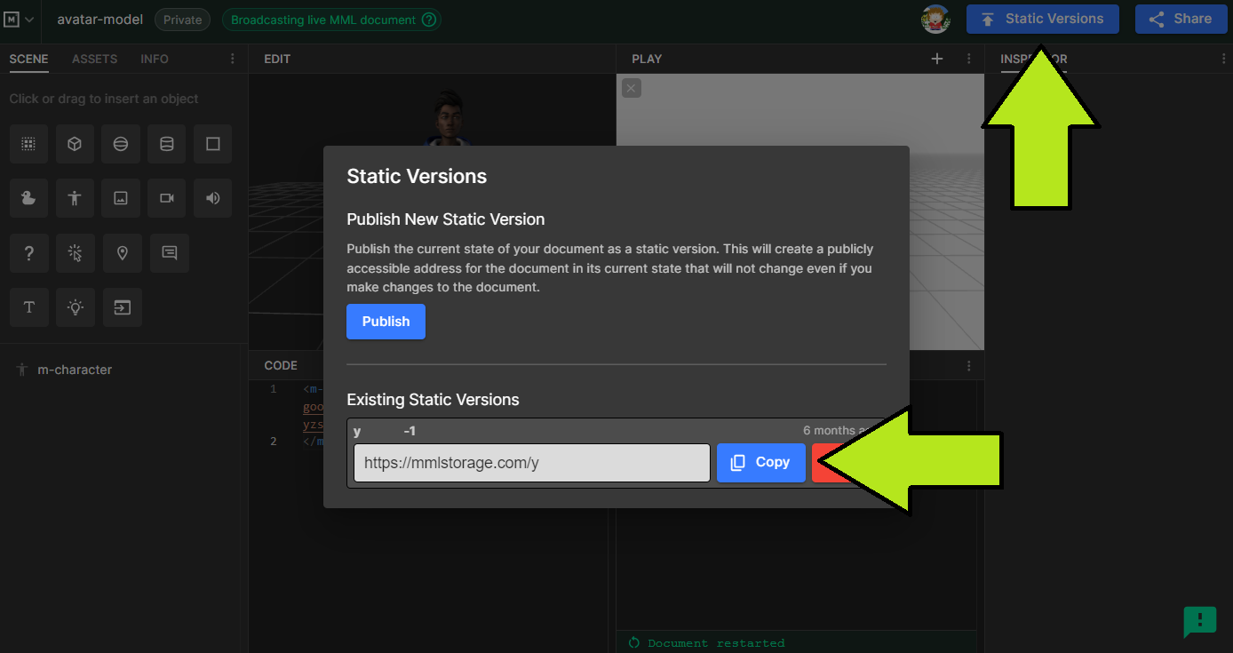 * Now you need to permanently store the MML. Click the `Static Versions` button at the top right and press `Publish`. The click `Copy` to copy the URL of your MML avatar.