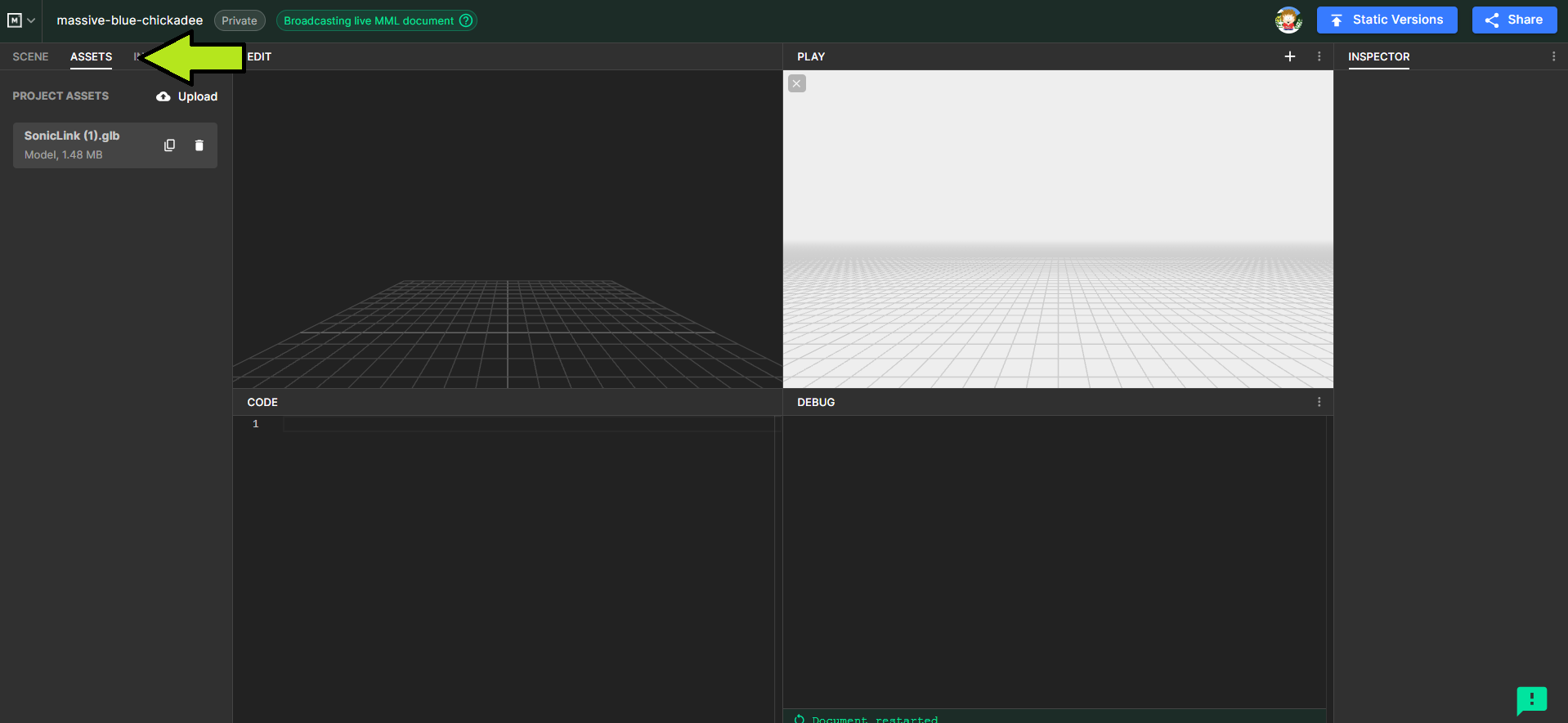 * Upload the .glb file you previously exported by going to the `Assets` tab and dragging your file in.