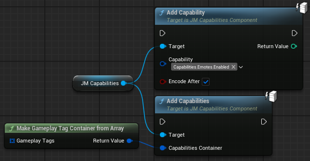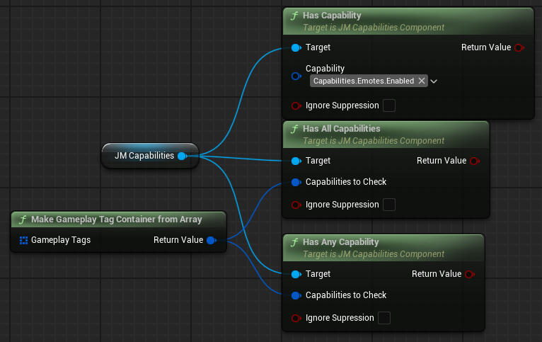 Once granted or removed, capabilities are replicated to the controlling client. Gameplay actions can be gated on capabilities by using any of the these functions: