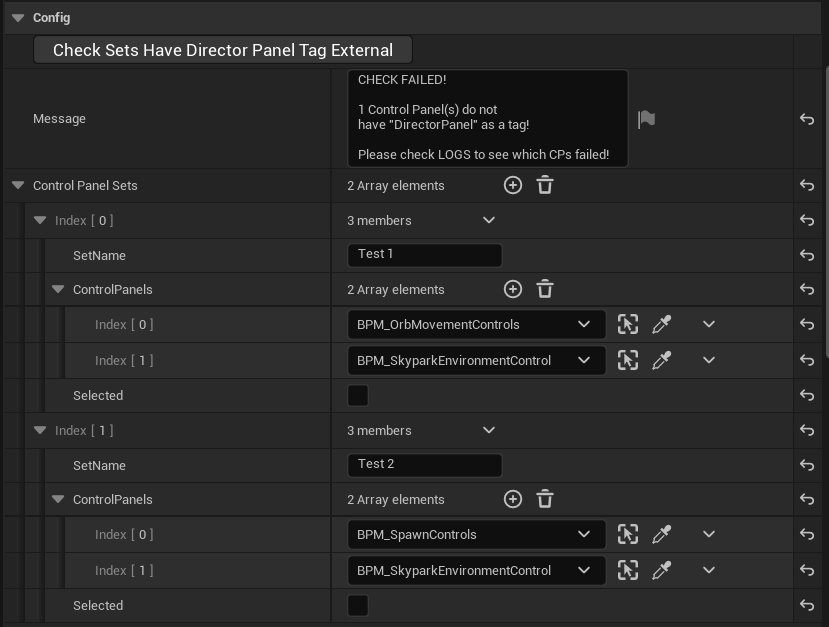 Each Set should include a set name and an array of what control panels you want to spawn. The array of control panels takes in Morpheus Actors as not all control panels derive from `BPM_ControlPanelBase`. There is also an editor function called `CheckSetsHaveDirectorPanelTagExternal()` to check whether the control panels added to the array have the correct tag **DirectorPanel**. If you forget to do this check, it will automatically ignore that control panel.