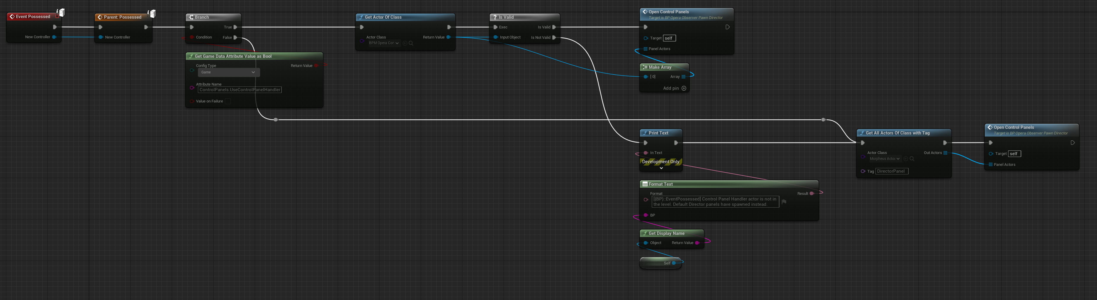 The example below only spawns this control panel if the live config value is *true*, otherwise it spawns the usual control panels for Directors. This is a made up live config value where a new one will need to be added to the relevant project’s live config JSON file. You can also do a check against whether the player character has the relevant Capability Tag **Capabilities.Director.UseControlPanelHandler**.