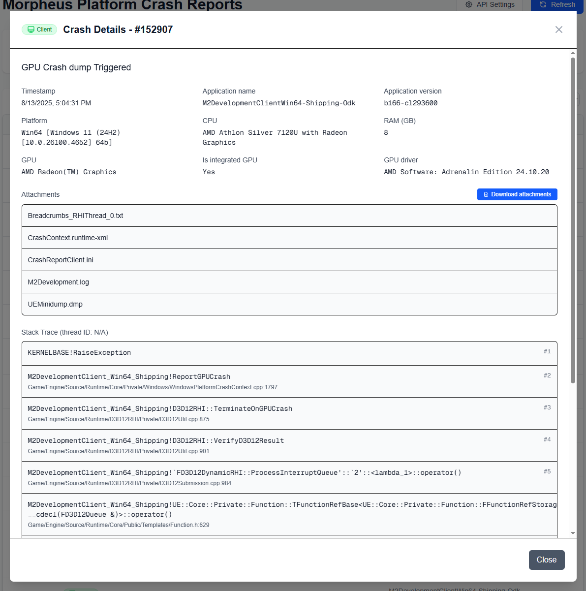 A GPU crash is always fatal, and it can be caused by a very large number of reasons. However, by far the most common one is that the user is using a device which is below the minimum spec listed in [minimum-hardware-requirements](https://docs.msquared.io/creation/running-events/player-entry/minimum-hardware-requirements "mention"). The majority of these crashes are from users trying to run the game using an integrated GPU, which is wholly incapable of handling Unreal 5.