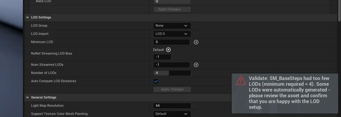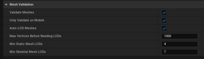 Auto-LOD Meshes- if this is true, then when you save meshes in-editor, if they fail the validation check, the required number of LODs will automatically be created for you.Max Vertices Before Needing LODs- if a mesh has fewer vertices than this, then we don't bother enforcing a minimum number of LODs (e.g. if we have a model that is already very low-poly, it won't need multiple LODs)Min Static Mesh LODs- how many LODs to require a large static mesh has.Min Skeletal Mesh LODs- how many LODs to require a large skeletal mesh has.