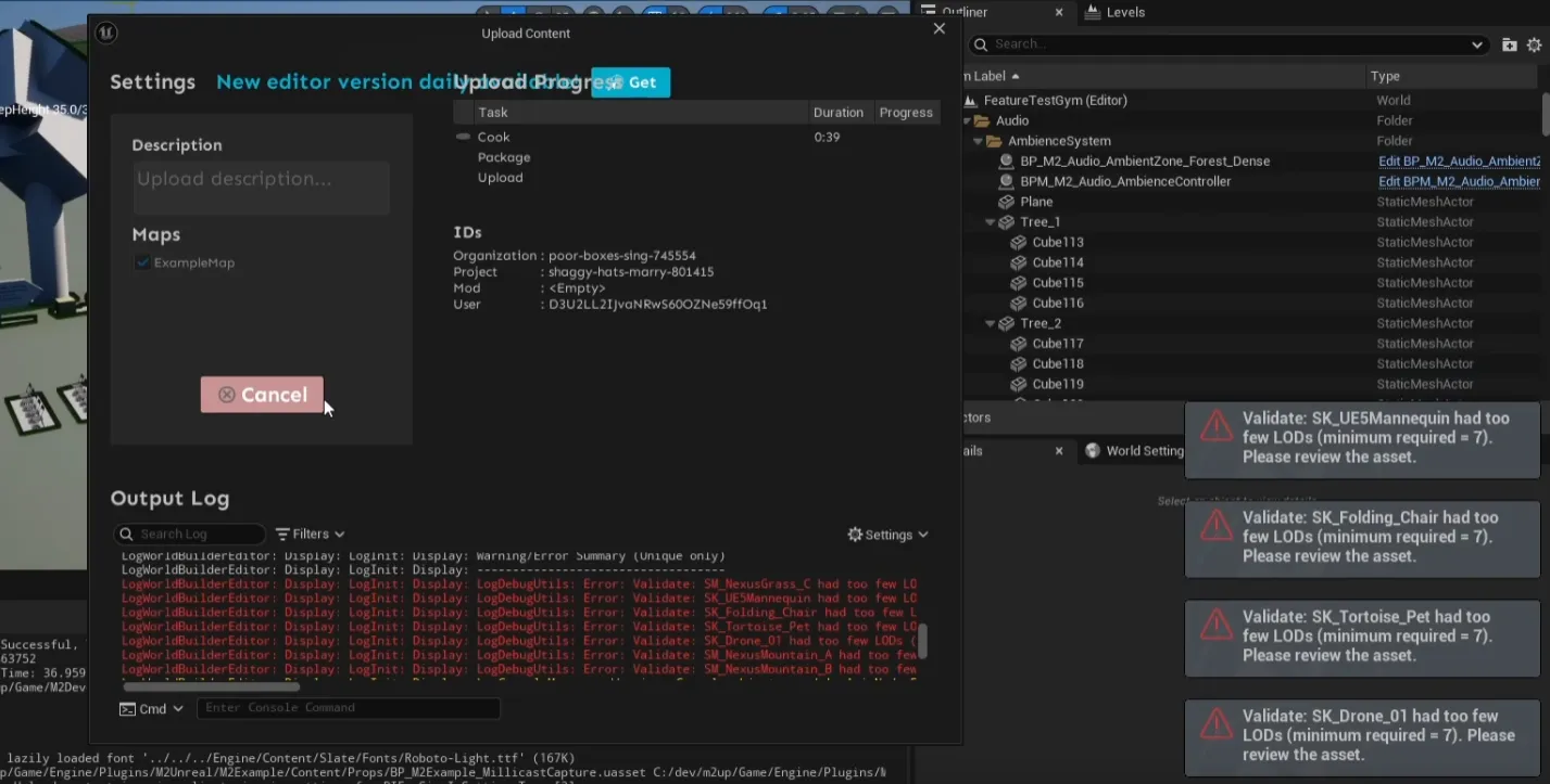 The checks will also be run when you cook your project (either in-editor, or externally, e.g. via CI). If assets exist that fail the mesh validation checks (i.e. they have too few LOD levels), the assets will be flagged. These assets will need to be fixed (they aren't fixed up automatically here, but can be fixed in-editor afterwards, e.g. by re-saving them)
