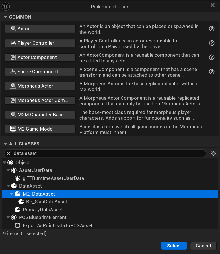 Typically, Unreal doesn't support creating custom data asset classes. To enable users to create their own custom data assets in BP, we have added a `M2_DataAsset`, which you can create blueprint classes that inherit from.