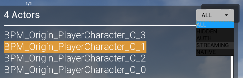 Actors in the actor list are optionally sorted by distance, and nearby actors will be clickable to select them in the entity list. Note the filter for different actor types in the top right.