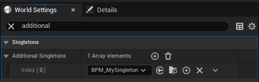 In the World Settings panel, locate the `Singletons` section, and add your new class to the `Additional Singletons` array.