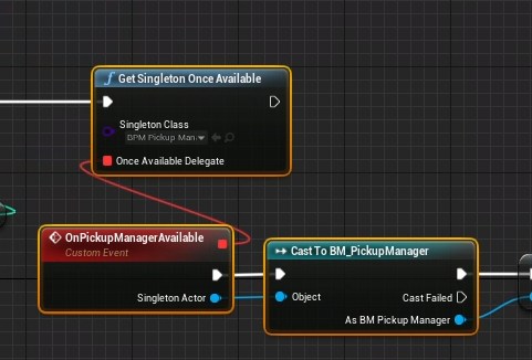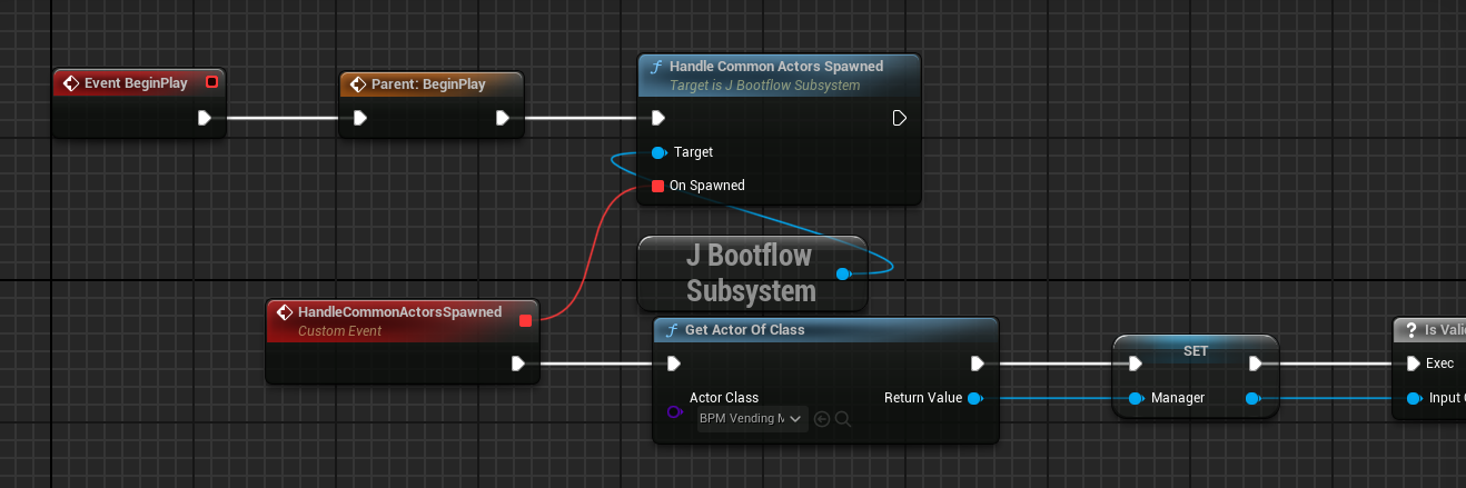 <figure><img src="https://1456550285-files.gitbook.io/~/files/v0/b/gitbook-x-prod.appspot.com/o/spaces%2FoWTlPaoHd1McSakqMigu%2Fuploads%2Fgit-blob-e5bff5a4f26b18b5ec6f4d038eeec5c81567e1f9%2Fimage.png?alt=media" alt=""><figcaption><p>This example will cache the singleton of type <code>BPM_VendingMachineManager</code> once it has been spawned. Other bootflow steps after <code>HandleCommonActorsSpawned</code> would also work here, e.g. <code>HandleBootflowFinished</code>.</p></figcaption></figure>