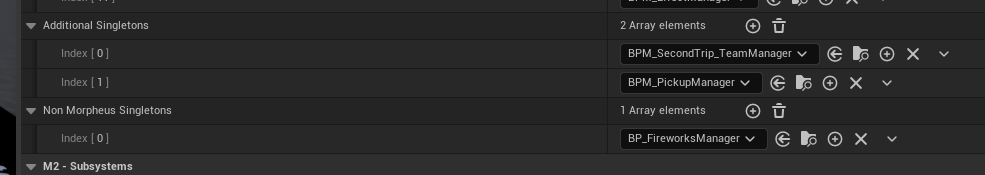 If you want this singleton behaviour but for non-Morpheus Actors, use the `Non Morpheus Singletons` array. Disconnected instances of your class will be spawned on the server and all clients. (This is similar to a subsystem, but preferable if you want control over which levels the object is present in.)