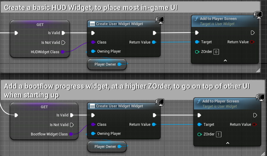 NOTE: It is recommended to be consistent whether you are using AddToPlayerScreen or AddToViewport. Both can be used, but the "player screen" is always beneath the "viewport", regardless of the ZOrder used for each.