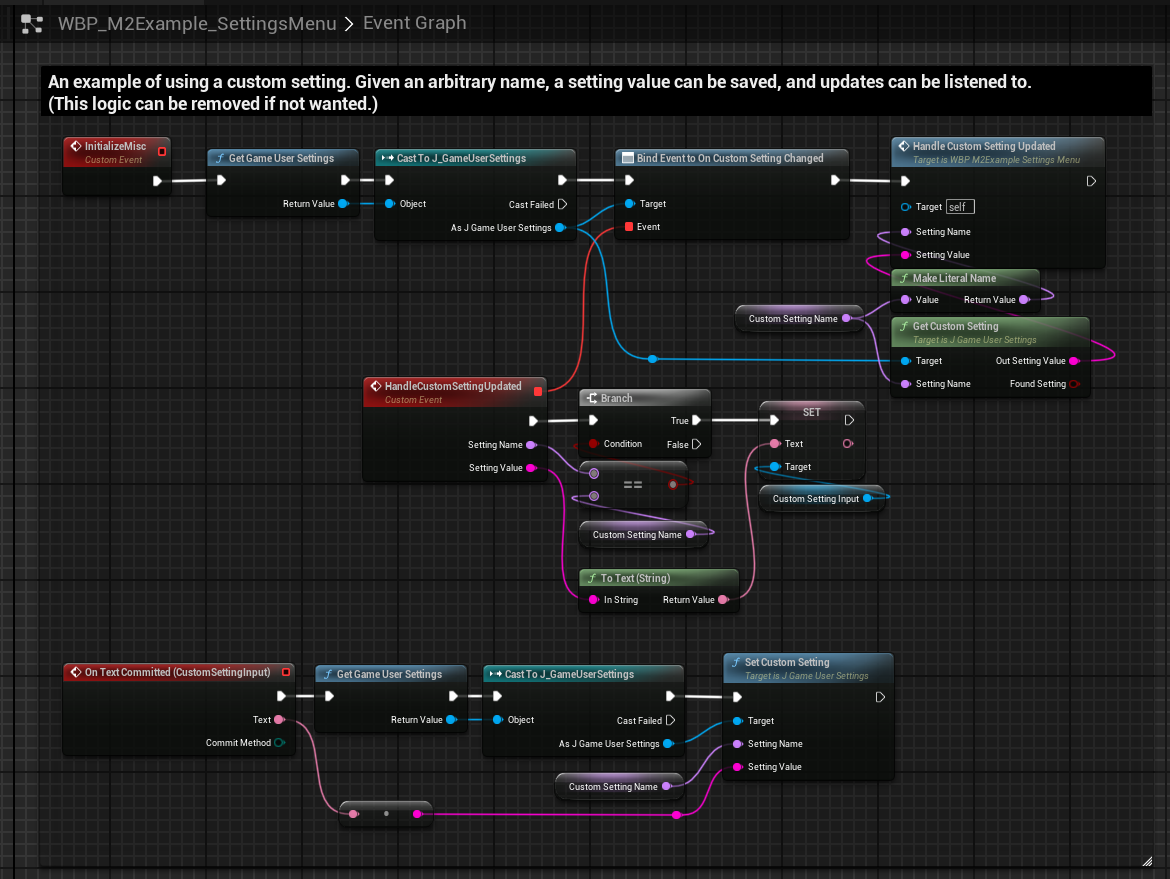 WBP_M2Example_SettingsMenu is an example of a simple settings menu, triggered from the HUD widget, and shows how to modify a number of in-game settings. This includes: