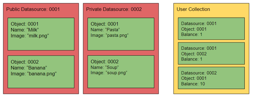 <figure><img src="https://1456550285-files.gitbook.io/~/files/v0/b/gitbook-x-prod.appspot.com/o/spaces%2FoWTlPaoHd1McSakqMigu%2Fuploads%2Fgit-blob-824177f1324d85bae7d9ae3691f05fb24f875f8b%2Fimage.png?alt=media" alt=""><figcaption><p>Diagram outlining the relationship between objects, datasources and user collections. You can see how the object definitions in the datasources have been populated with metadata. You can see all objects in the public datasource are added to the user collection. You can also so that this user collection also contains 10 "pasta" objects but no "soup" objects.</p></figcaption></figure>