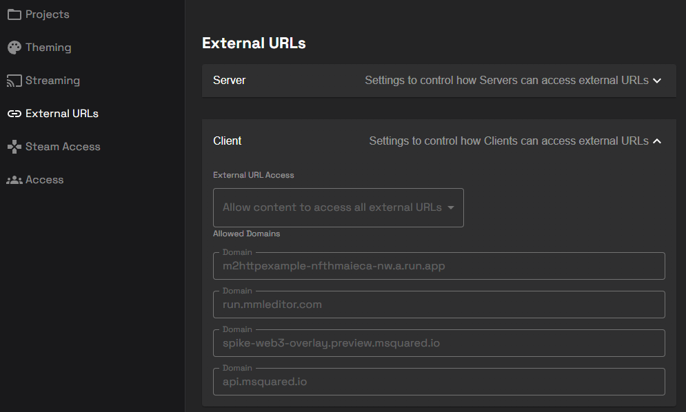 From v40 of the M2 platform, the WebUI browser will respect the access policy configured in the `External URLs` section of each project's admin dashboard, so it behaves the same as any other web request. If you have any access controls set up then you will need to add any domains to the allow list.