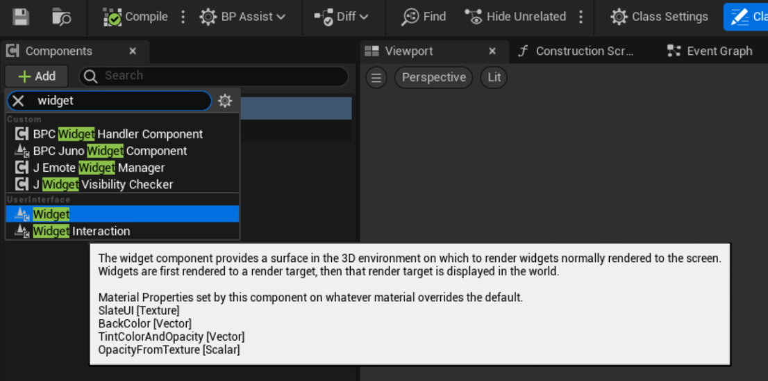 <figure><img src="https://1456550285-files.gitbook.io/~/files/v0/b/gitbook-x-prod.appspot.com/o/spaces%2FoWTlPaoHd1McSakqMigu%2Fuploads%2Fgit-blob-ca80871ba117d487a4bfc7ee8efa3146974d488a%2Fimage.png?alt=media" alt=""><figcaption><p>The Widget component being added to the actor.</p></figcaption></figure>