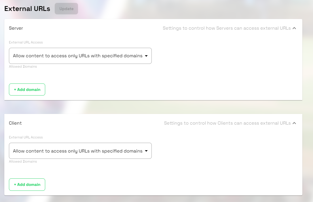 | Allow content to access all external URLs                | <p>Disables the filtering.<br><br>This option is not recommended.</p>                                                                                                                           | Any domain is allowed.                                                                                                                                                                                                   |