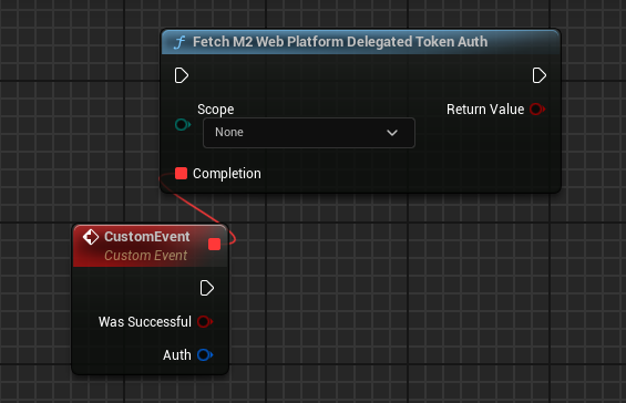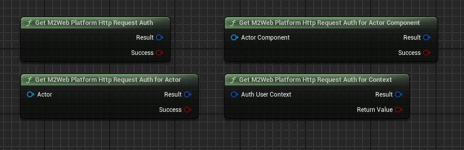 The simplest node is the `Get M2 Web Platform Http Request Auth`, which gets the authentication for the first local user. If the code is running on a server, the server's authentication will be used, if on a client then the auth for the first local player will be used.