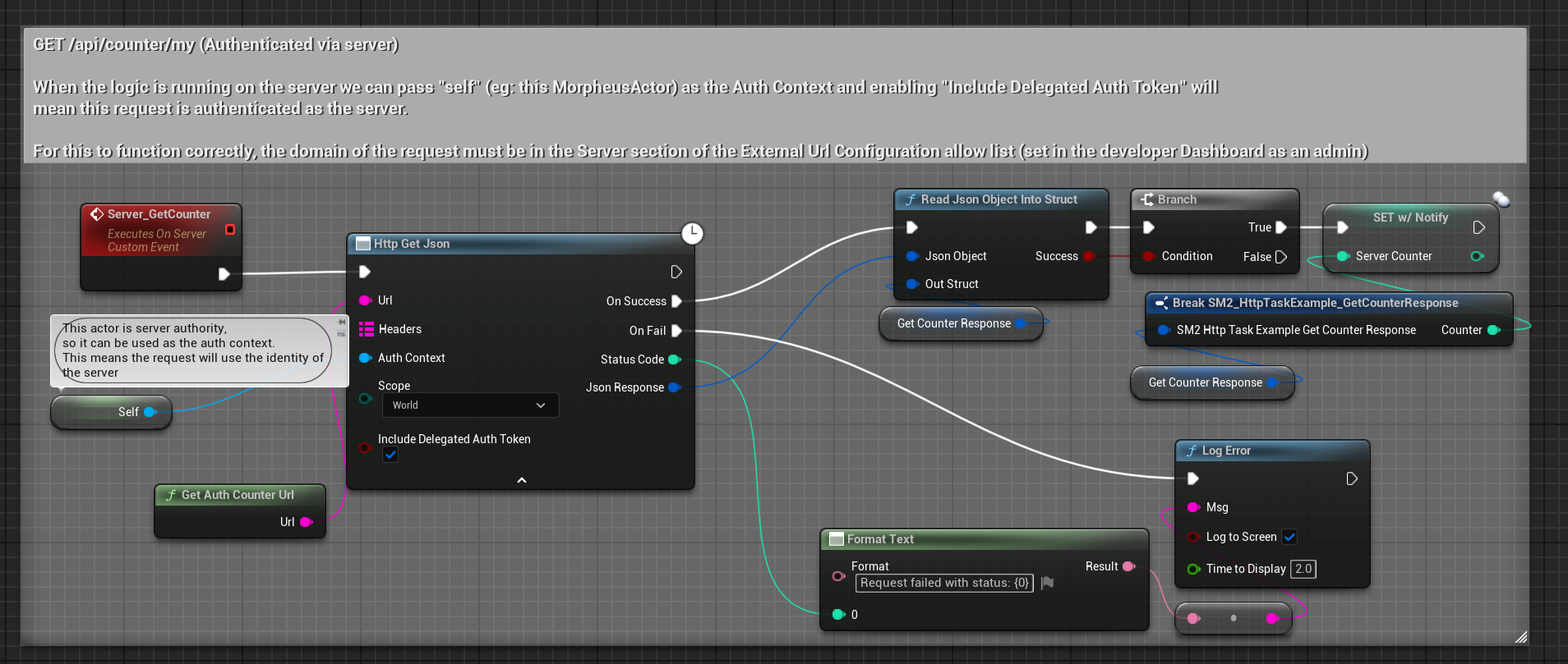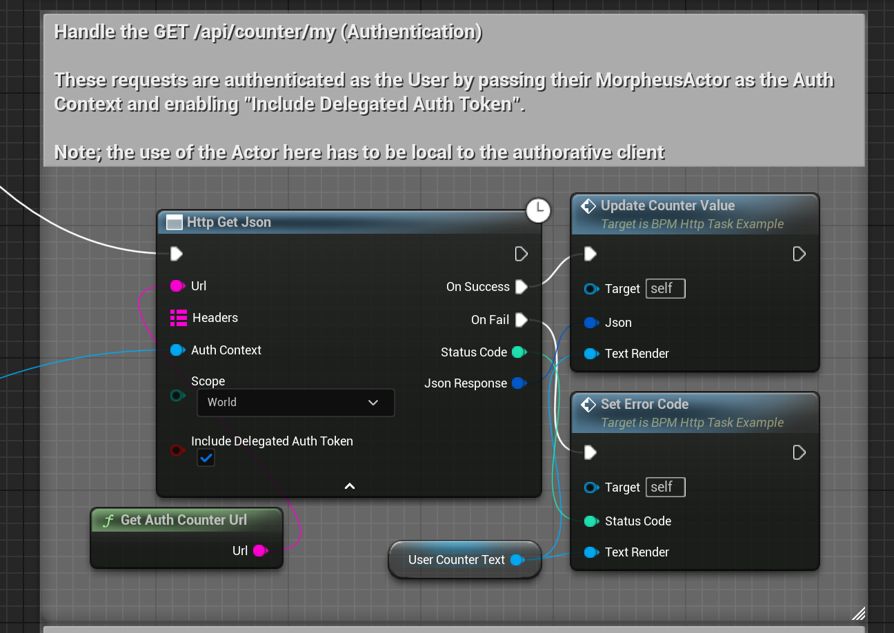 A note on Auth Contexts. Auth Contexts determine how we pick up the identity of the actor making the request. For example, if a client is making the request via an interaction, this Auth Context will always be the Morpheus Actor (or an attached Morpheus Actor component) owned by that client. For a server, it can be the Authorative actor (assuming it is running with server authority). Auth Contexts are local to the client/server and cannot be executed remotely; eg: you cannot make a http request using the Auth Context of another actor you're not authoritative over.