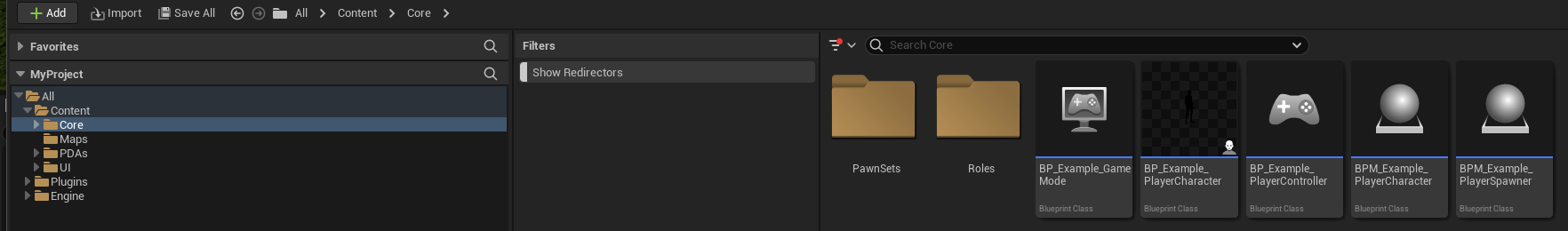 * `BP_Example_PlayerController` and `BP_Example_PlayerCharacter` are your player controller and pawn respectively. These behave the same as the native Unreal equivalents, except that they perform no replication.