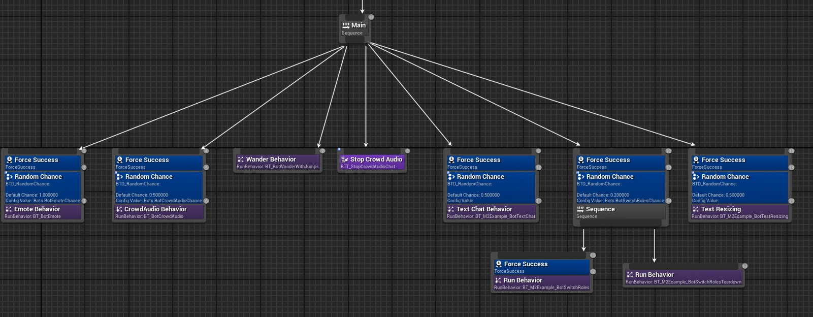 Authenticated Bots are configured to mimic a real players gameplay actions via the `BT_M2Example_BotFullBehavior` which includes: