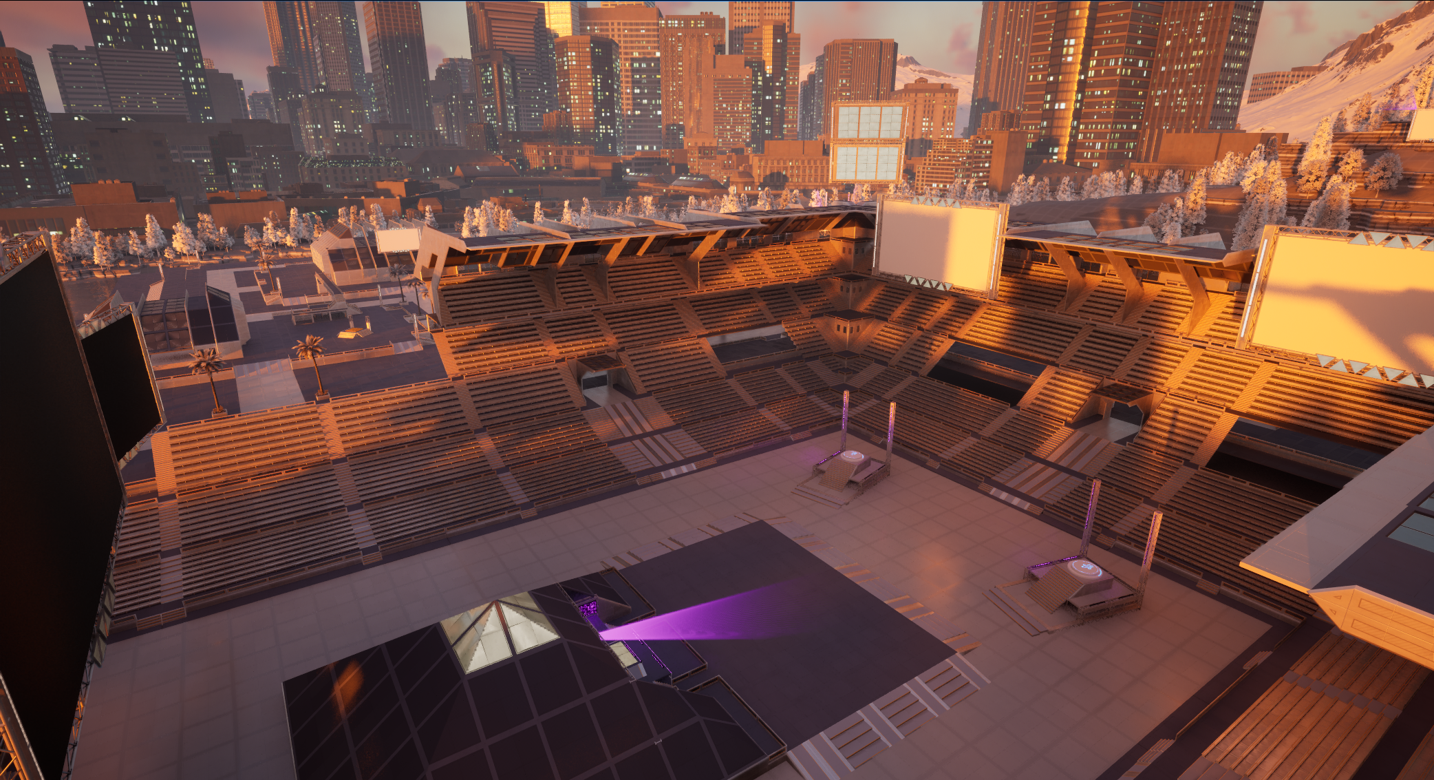 The [**Example Map**](https://docs.msquared.io/creation/unreal-development/features-and-tutorials/the-m2-example-plugin) (with the **ScaleTestSublevel** enabled) is our profiling test environment; it's a large map with mixed characteristics, including foliage, a stadium and an elaborate city background. Nanite is used throughout, and Lumen is enabled in supported hardware. Standard post-processing (anti-aliasing, bloom, tone-mapping, etc.) is used. Screens are used to stream two different [Millicast](https://docs.msquared.io/creation/unreal-development/features-and-tutorials/video-players/millicast-video-streaming) sources.