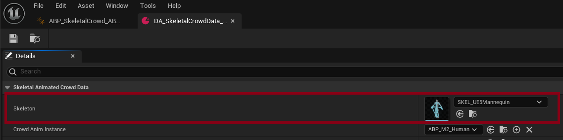 `USkeletalAnimatedCrowdData` data assets will need updating to specify the `USkeleton` used by the crowd, if this hasn’t been done already. See below: