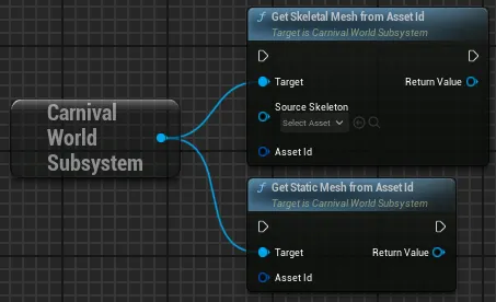 `CarnivalSkeletalMesh::GetFromAssetId` → `CarnivalWorldSubsystem:: GetSkeletalMeshFromAssetId`