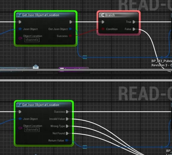 The `GetJsonObjectAtLocation` function has had its nodes changed, so that instead of logging warnings and outputting a bool, it uses different execution pins for the assorted outcomes. This enables users to more clearly see the various failure cases and handle accordingly (instead of e.g. always warning if the object doesn’t exist, where it may actually be optional)