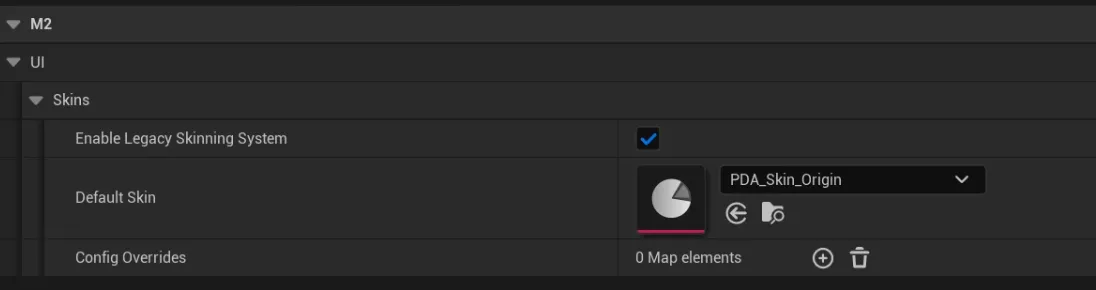 Launch the editor and go to **Project Settings** > **M2 UI Skins** and enable the Legacy Skinning System. Ensure your default skin is set, this will either be PDA\_Skin\_Origin (the previous M2 default) or something you have created project-side.