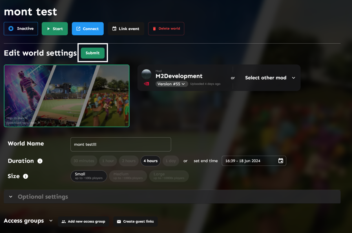 From the tab on the left you can find your world page. From here, you will be able to modify everything about your world while it is inactive including linked event, access groups, and other relevant world settings.