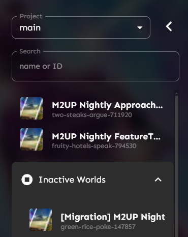 <figure><img src="https://1456550285-files.gitbook.io/~/files/v0/b/gitbook-x-prod.appspot.com/o/spaces%2FoWTlPaoHd1McSakqMigu%2Fuploads%2Fgit-blob-aec3dad4e7ab39153c86d675990b4ac055092ae5%2Fimage.png?alt=media" alt="" width="185"><figcaption><p>The Worlds selection tab on the left-side of the page, showing the Inactive Worlds tab.</p></figcaption></figure>