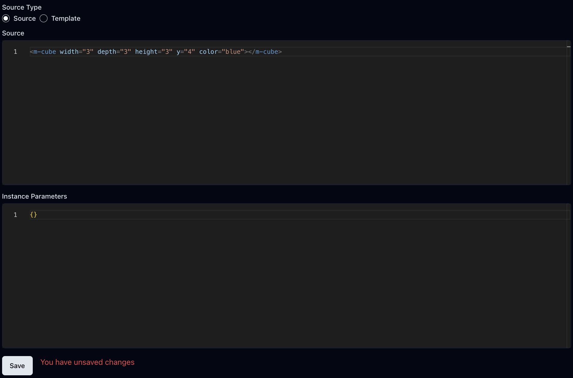 You will be redirected to your newly created object page. Here, you can change several parameters. The one we're interested in is Source. You can add your MML code there. Copy and paste the code below into the web editor and click Save.