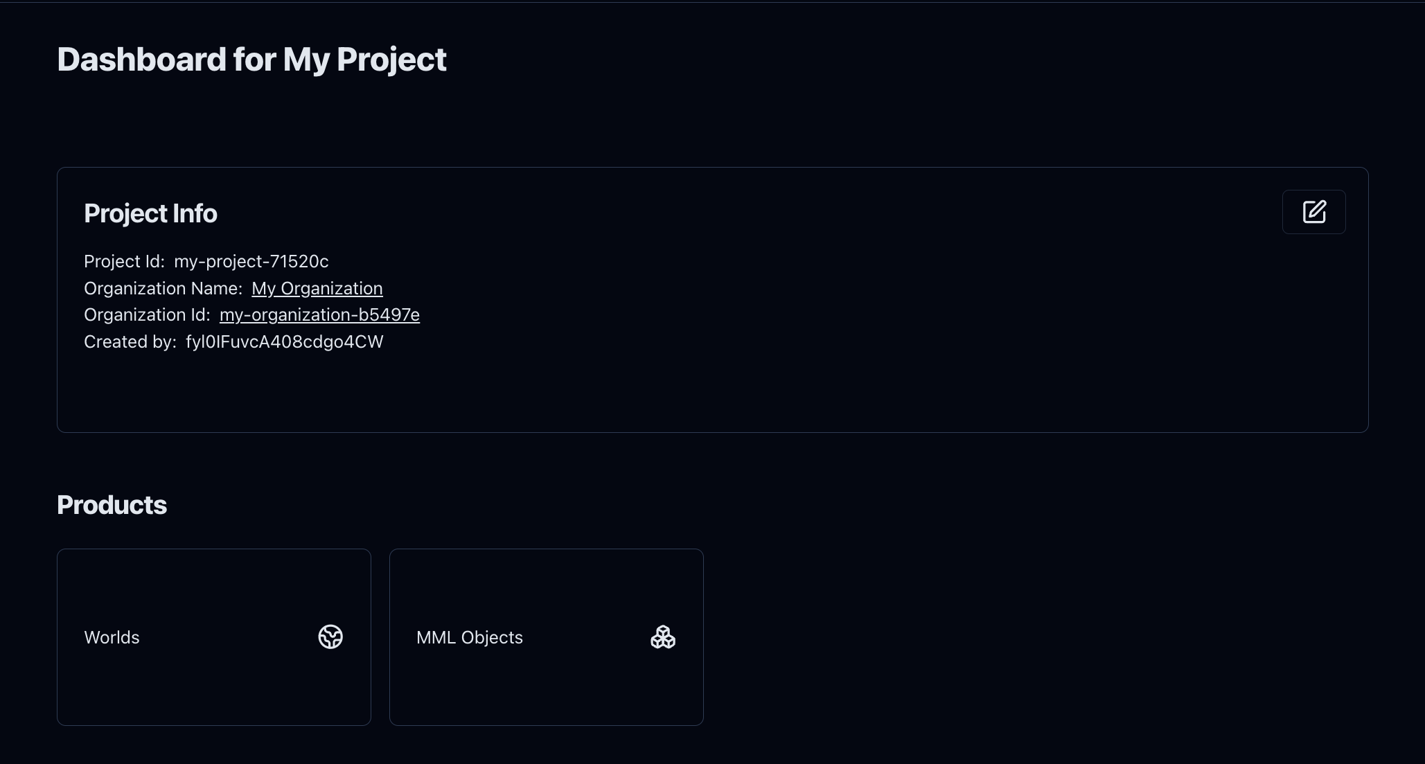 You will find yourself in your project dashboard. Here, you will find the different MSquared products you can use for your project. Click Worlds to create your first world.