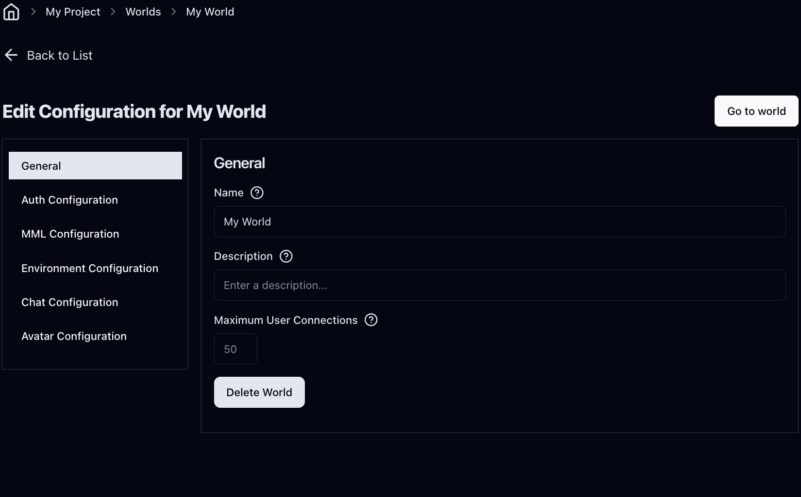 You will be redirected to the world configuration page. Here, you can change several settings for your experience, from authentication to some graphics settings. You will find more information about all the different options in Edit World.