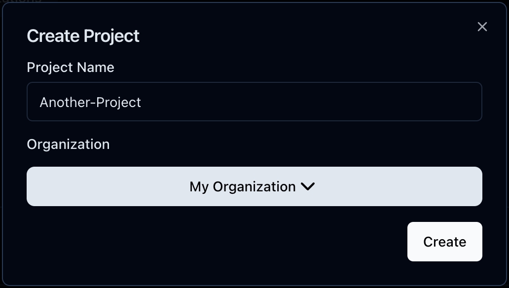 You can then click Projects on the right and Crete Project. If you create a project on this page, the organization field will be pre-selected and can't be changed.