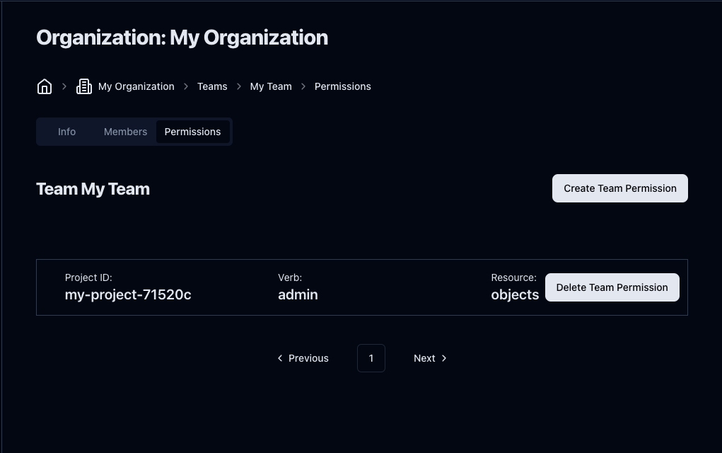 Clicking Delete Team Permission will open a confirmation modal. Click on Delete to delete the permission.