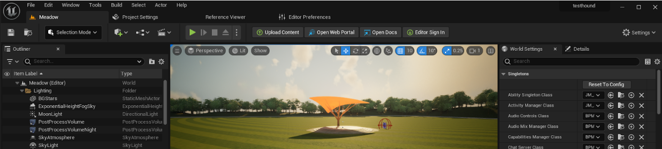The M² editor is an extended Unreal Editor including plugins for creating worlds with high-scale rendering/networking/audio, MML, interoperable objects, avatars, and tooling to upload to our content pipeline.
