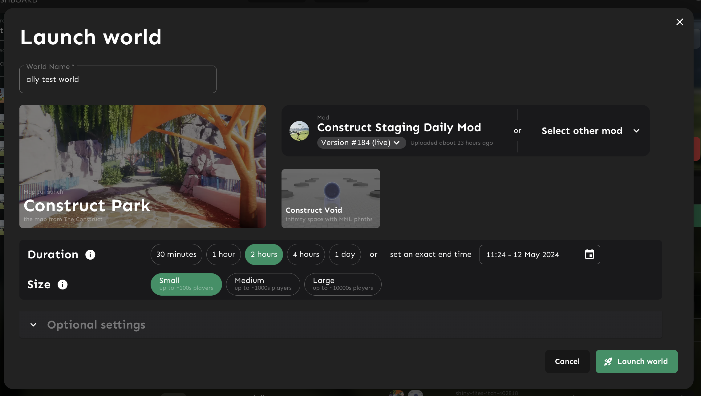 Worlds are single instanced virtual spaces, individually capable of up to \~10ks CCUs. Worlds are launched by clicking `Launch` in the header and involve selecting a map (from a mod), runtime, size (how many players can it handle), and more.
