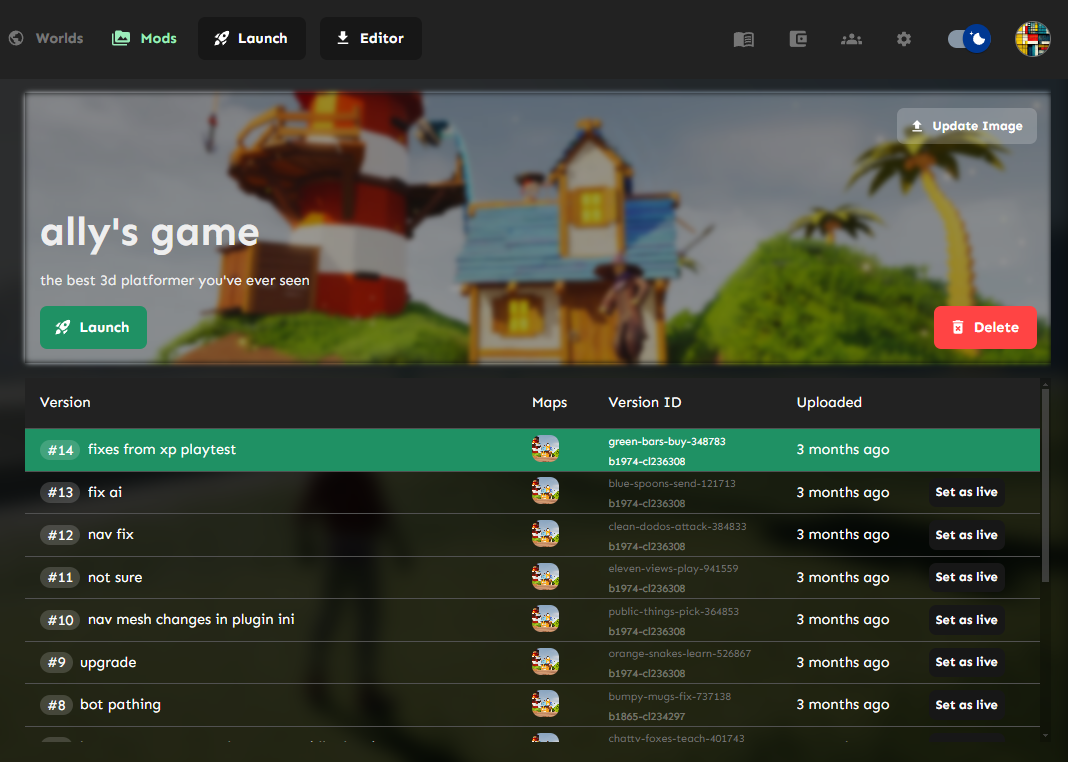 Mods can be viewed in the `Mods` tab of the dashboard. Below, you can see the `ally's game` mod, and a history of the 14 different versions of it that have been uploaded.