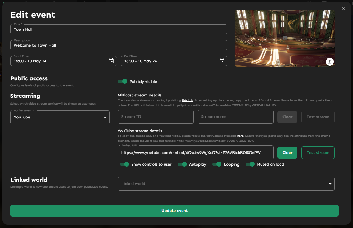 Events are a dedicated concept for engagement of users into a running world. You can create an event to advertise your metaverse events ahead of time using them as placeholders on your end user website with calendar links, YouTube trailers, and more. At show time, you can link the event to a running world to connect users into a world based on your content.